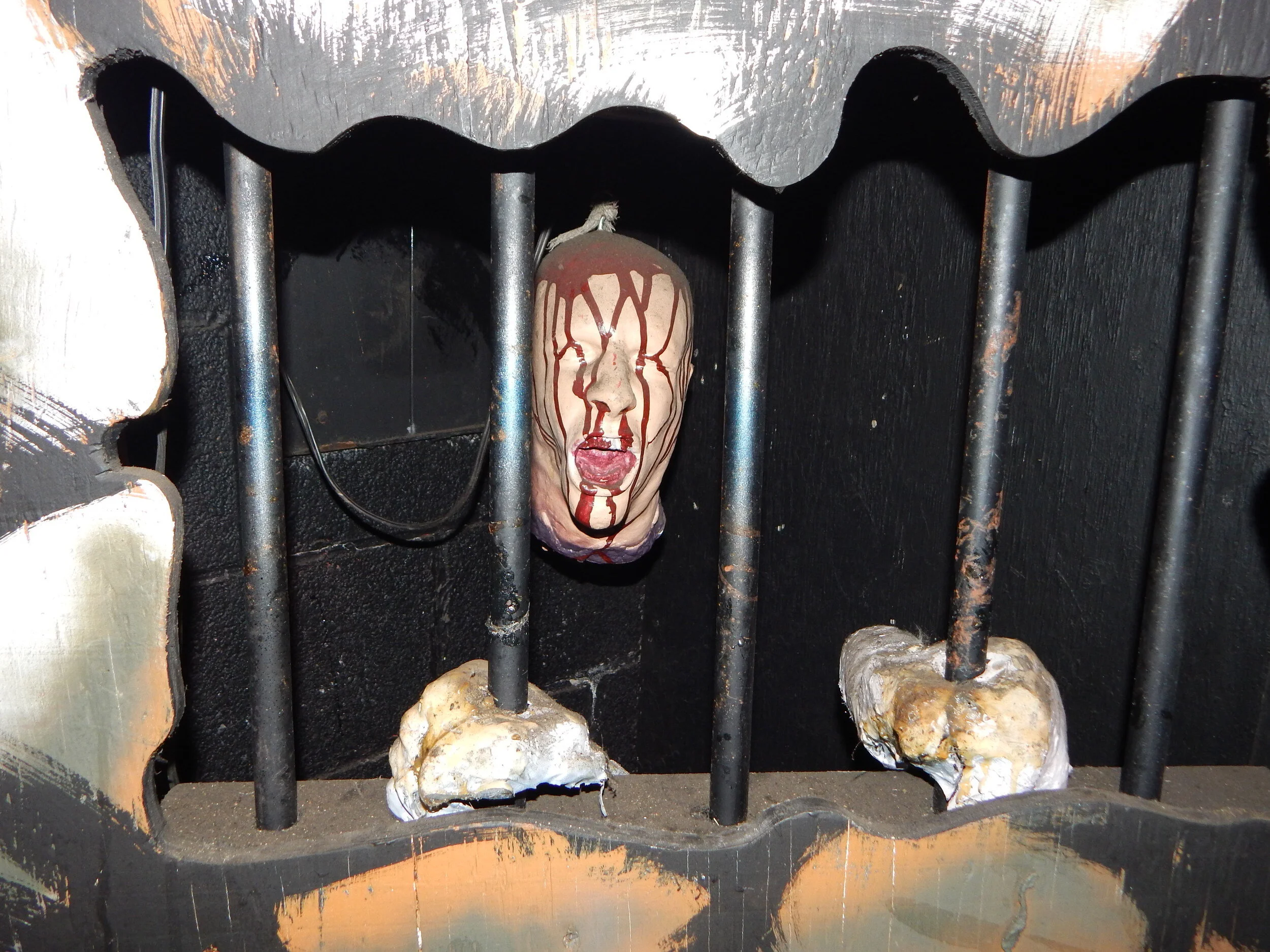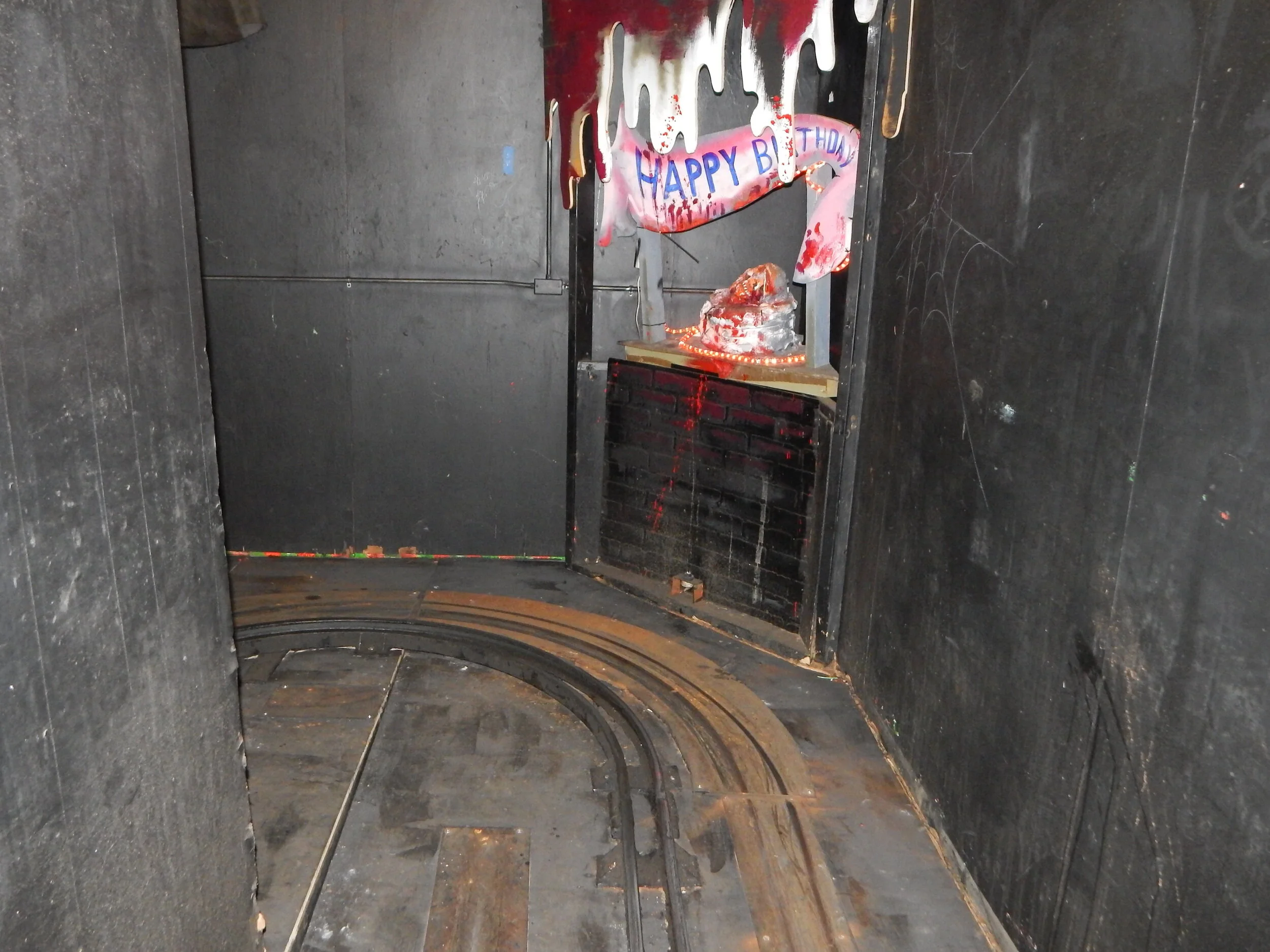 After that it goes into full wild mouse mode, with incredibly tight corners that toss you this way and that in the padded car, throwing the occasional hand-made scene of horror at you with a flash of light or loud noise. The scenes are as low-tech as they come, which adds to the fun. The park refurbished it recently and intentionally went with a 1970’s era homemade vibe. (We got a lights-on walking tour of the ride, which is where these photos come from. It’s really dark in there when the ride is operating).